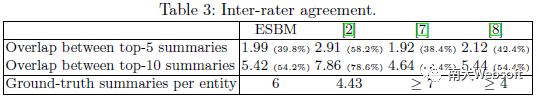 总体而言,ESBM包含175个实体,共6584个三元组。其中,37.44%的三元组被选入过top-5摘要,而58.15%的三元组被选入过top-10摘要。每个实体由6个用户标注。然而,大多数三元组仅被一个用户选入过标准摘要。20.46%三元组被至少两个用户选入过top-5摘要,而对top-10摘要该比例则为40.23%.