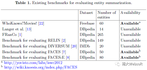 然而,实体摘要领域的发展面临两个挑战。其一,是缺乏高质量的评测集。表1列出了实体摘要领域目前已知的评测集。可以看出,这些评测集都基于单个数据集,并且所包含的实体数量也有限。在列出的7个评测集中,其中4个已无法公开获取,而WhoKnows?Movies!面向特定领域的摘要任务,而FACES和FACES-E所构造的评测集则未包含取值为字面量或类的三元组。其二,是缺乏统一的评测实验,缺乏为后续研究和应用在技术选择上提供参考的依据。面对这两个挑战,我们提出ESBM评测集,在其设计中克服现有评测集的上述问题,同时基于ESBM对大量现有实体摘要方法进行了统一的实验比较。