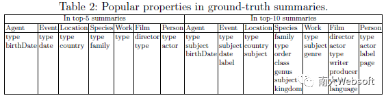 下表列出了各类实体中,出现在至少一半的标准摘要中的属性。平均每个实体包含13个不同属性,而该表中的结果是仅有一两个属性是top-5标准摘要中常见的。这说明各个实体的标准摘要涉及的属性各有不同,所以通过人工为每个类型制定实体统一制定摘要的方式不太可行。