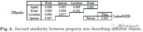 我们再来分析实体的异质性。下图列出了不同实体类型所涉及的属性集之间的Jaccard相似度。结果表明不同类型间该相似度极低,体现了不同类型实体描述之间的较高的异质性, 也说明ESBM选择的数据有助于评价实体摘要方法的泛化能力。