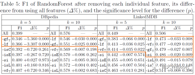 对于监督学习方法,我们进行消融实验分析7个特征对模型效果的影响,结果如下表所示。可以看出,属性的全局频度(gf_T),属性的局部频度(lf),对模型效果有显著影响,删除这些特征将导致摘要效果显著降低;取值的全局频度(vf_T),三元组的自信息(si)仅在LinkedMDB数据集上表现出显著有效。而关于取值类别的三个布尔型特征,即取值是否为类型(isC)、是否为实体(isE)、是否为字面量(isL)则未带来摘要F1值的显著变化。