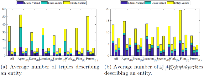 下图按实体类型呈现了ESBM中各实体集的三元组构成情况。我们分析ESBM中三类实体集:实体描述、top-5摘要、top-10摘要,分别对应柱状图中每组的左、中、右三个柱子。图(a)统计取值分别为字面量(Literal)、类型(Class)和实体(Entity)的三类三元组在各集合中的数量。 可以看出取值为字面量的三元组,虽然在实体描述中占比不高,但在标准摘要中都占有较大的比例,其在top-5和top-10摘要中分别占比30%和25%。这说明,若实体摘要方法将字面量类型的三元组排除在任务之外,将影响其摘要质量。图(b)统计的是各类三元组所占属性的个数。其中,在top-5摘要平均包含4.7个不同属性(非常接近5),说明用户倾向于从不同属性中选取三元组来构造摘要,避免出现属性的冗余。