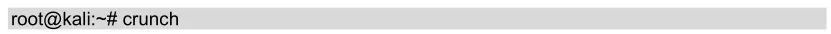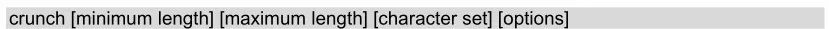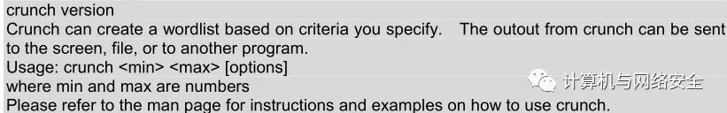 输出的信息显示了crunch命令的版本及语法格式。其中,使用crunch命令生成密码的语法格式如下所示: