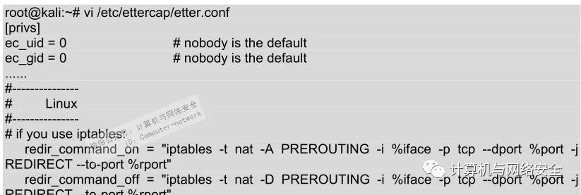 (2)使用VIM编辑etter.conf配置文件。将该文件中ec_uid和ec_gid配置项值修改为0,并将Linux部分附近IPTABLES行的注释去掉。修改结果如下所示: