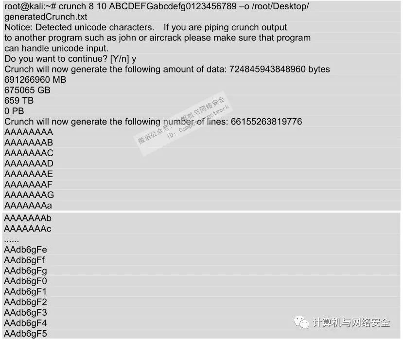 从以上输出的信息中,可以看到将生成659TB大的文件,总共有66155263819776行。以上命令执行完成后,将在桌面上生成一个名为 generatedCrunch.txt 的字典文件。由于组合生成的密码较多,所以需要很长的时间。