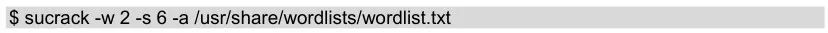 ● -w:是在SUCrack能够利用的线程数。因为SUCrack是多线程的,用户可以指定希望运行的线程数。这里建议仅使用1个,因为当每个尝试登录失败时,延迟3秒后将重新尝试连接。