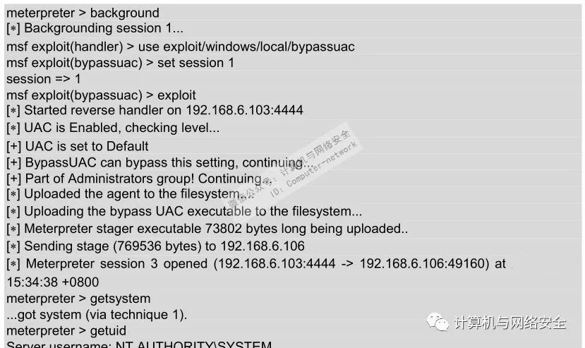 从输出的信息中,可以看到该用户的权限是一个普通权限。接下来,使用 bypassuac模块绕过UAC。