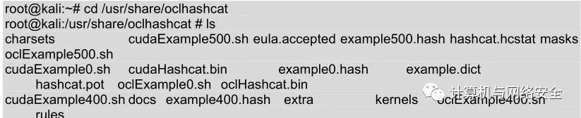 使用OclHashcat工具之前,一定要确定当前系统已正确安装了NVIDIA显卡驱动。在Kali 中,OclHashcat 默认安装在/usr/share/oclhashcat 目录中。所以需要先切换目录到OclHashcat,再启动OclHashcat工具。执行命令如下所示:
