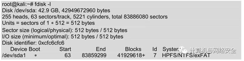 输出的信息表示当前系统中有一块磁盘,并只有一个分区。该文件系统类型是NTFS,也是Windows系统的所存放的磁盘。