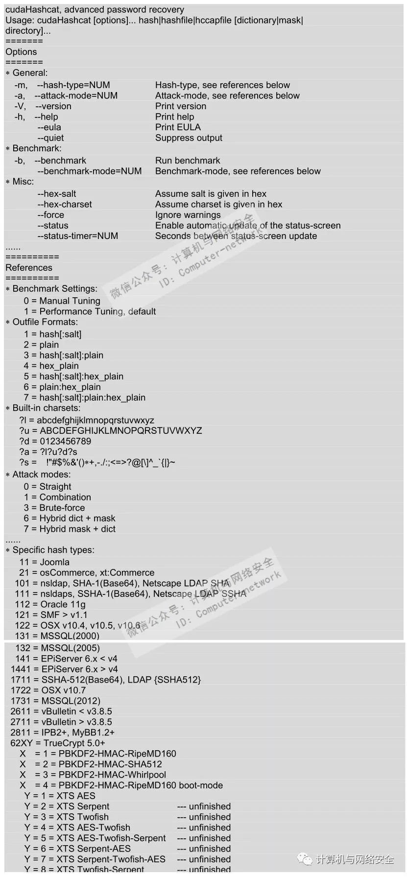 输出的信息显示了cudaHashcat.bin命令的语法格式、可用选项及配置例子等。