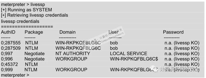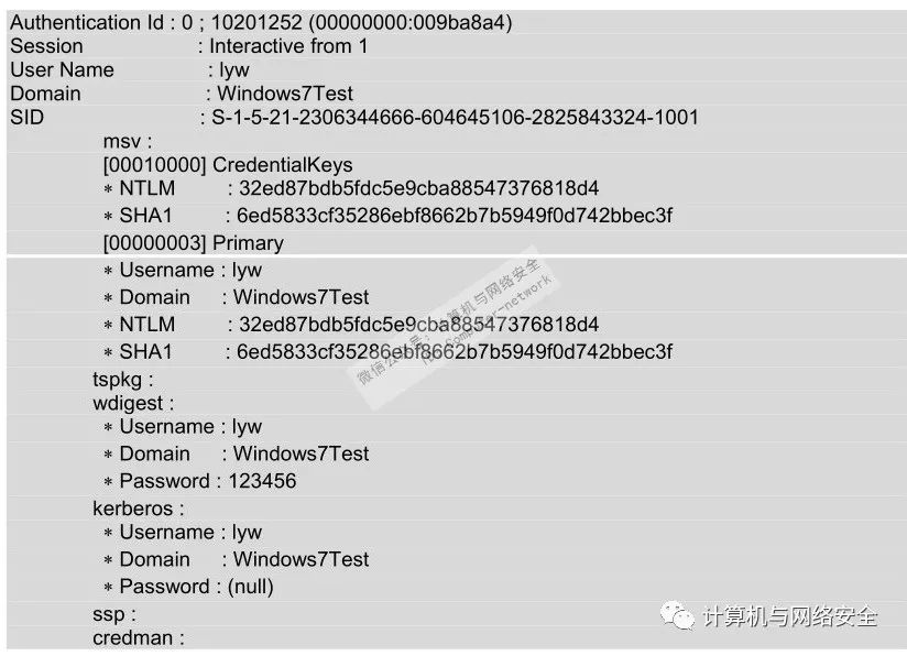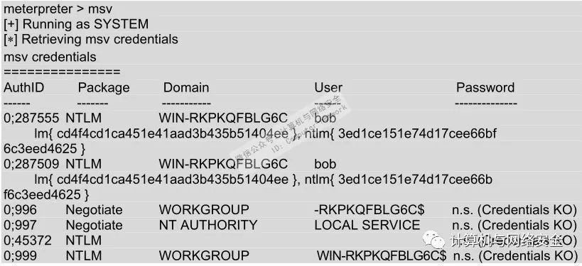 执行以上命令后,输出五列信息。分别表示认证ID、包、域名、用户名和密码。从该界面可以看到,当前系统中 bob 用户的哈希密码值中。在哈希密码值中,前面的 lm 表示使用LM方式加密;ntlm表示使用NTLM方式加密。