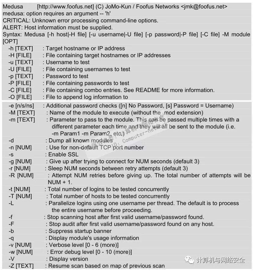 或者在桌面上依次选择“应用程序”—Kali Linux—“密码攻击”—“在线攻击”—medusa命令,将输出如下所示的信息: