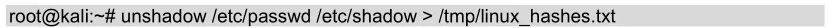 执行以上命令后,会将/etc/passwd/文件与/etc/shadow/文件结合在一起,生成一个叫做linux_hashes.txt的文件,保存在/tmp/目录中。
