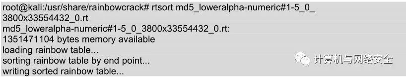 (3)为了容易使用生成的彩虹表,使用 rtsort 命令对该表进行排序。执行命令如下所示:
