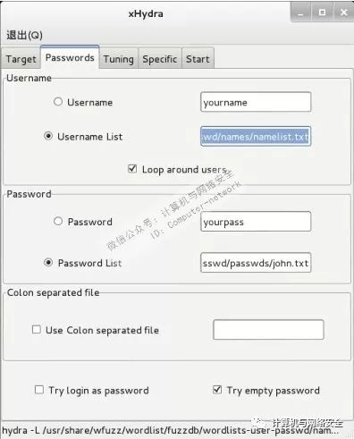 (3)在该界面指定用户名和密码列表文件。本例中使用Kali系统中存在的用户名和密码列表文件,并选择 Loop around users 选项。其中,用户名和密码文件分别保存在/usr/share/wfuzz/wordlist/fuzzdb/wordlists-user-passwd/names/nameslist.txt和/usr/share/wfuzz/wordlist/fuzzdb/wordlists-user-passwd/passwds/john.txt中。