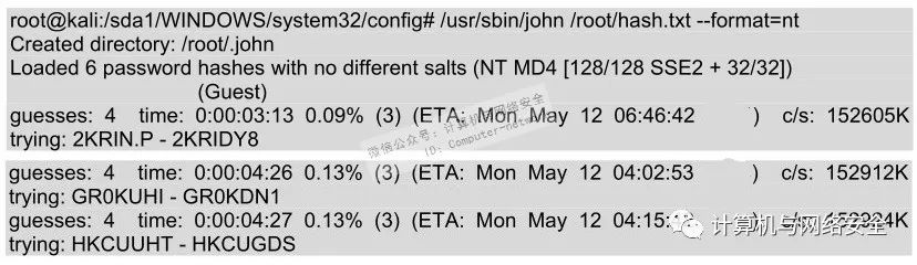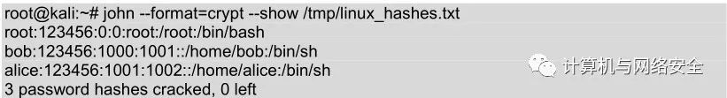(5)运行john命令,实现密码攻击。执行命令如下所示: