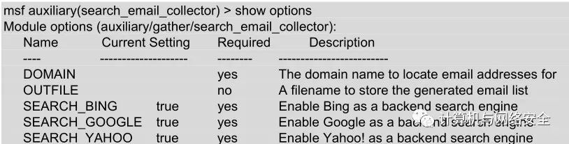 (4)查看search_email_collector模块下有效的选项。执行命令如下所示: