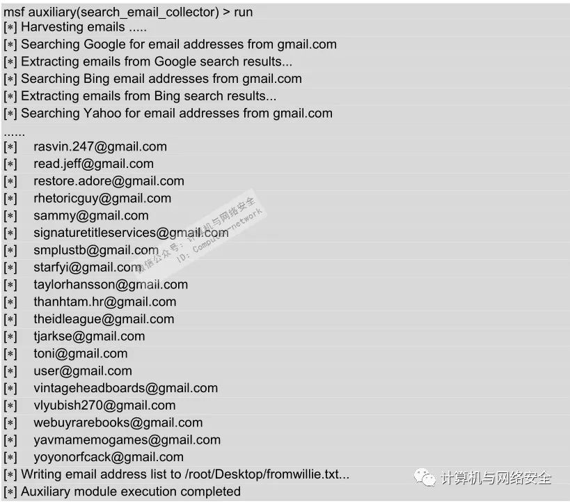 输出的信息显示了所有 gmail.cm 的邮箱地址,并且将所有信息保存在 fromwillie.txt文件中。此时用户可以根据收集到的邮箱用户信息,猜测它的密码。