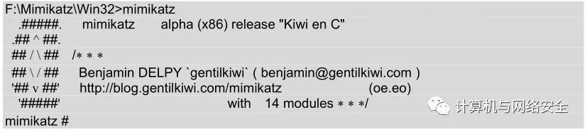 输出信息显示了mimikatz的一些相关信息,其中mimikatz #提示符表示成功登录到了mimikatz程序。