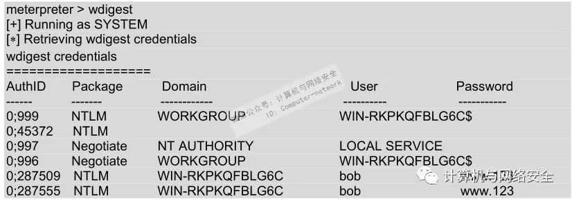 从输出的信息中可以看到,输出的信息类似msv命令输出的信息。唯一不同的就是,这里可以看到使用哈希加密的原始密码。从以上信息中,可以看到 bob 用户的密码为www.123。