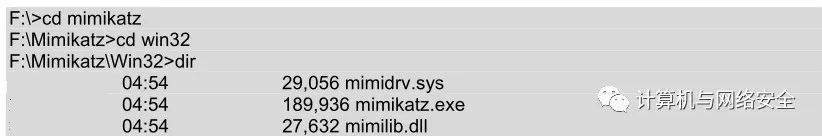 从输出的信息中,可以看到Win32目录中有三个文件。其中,mimikatz是一个可执行文件。