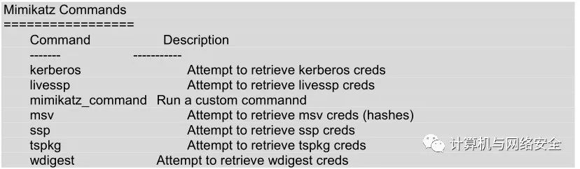 以上输出信息显示了可执行的Mimikatz命令。如回复kerberos信息、livessp信息和哈希信息等。