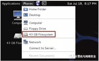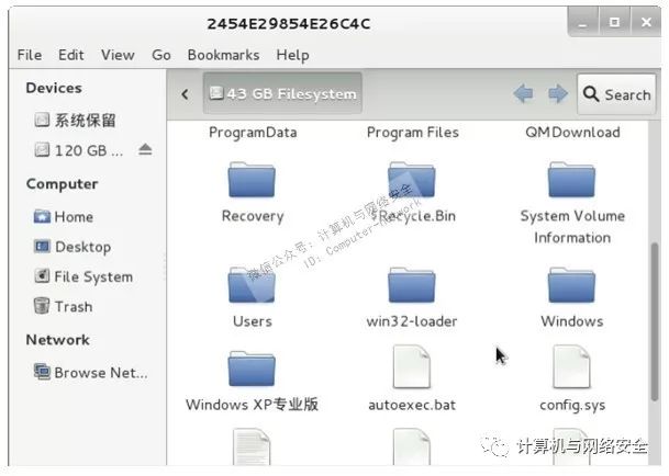 (3)在该界面打开 Windows 文件系统。在 Kali Linux 桌面依次选择 Places—43GB Filesystem选项,将打开如图9所示的界面。这里的43G表示当前Windows系统的磁盘大小。