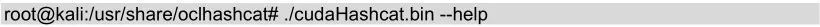 以上输出结果显示了OclHashcat目录下所有的文件。其中,cudaHashcat.bin可执行文件是用于破解密码文件的。在使用该可执行文件之前,先查看下它的帮助文档。执行命令如下所示: