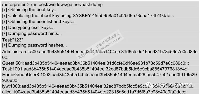 (4)查看目标主机上所有用户的哈希密码值。执行命令如下所示: