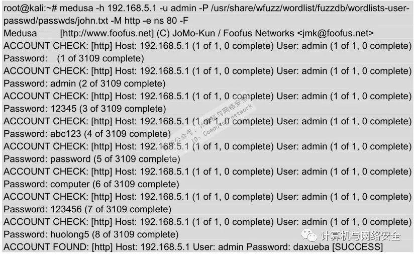使用medusa暴力破解地址为192.168.5.1的路由器,执行命令如下所示: