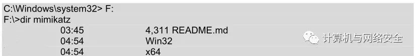 从输出的信息中,可以看到 mimikatz 目录中有三个文件。其中 Win32和 x64表示mimikatz的两个版本。根据自己的系统架构选择相应的版本,本例中的操作系统是32位,所以选择使用Win32。