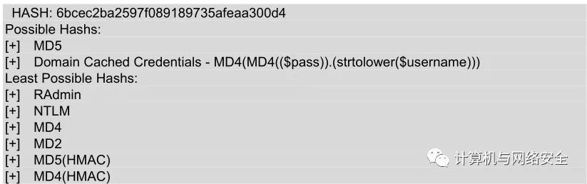 从输出的信息中,可以看到6bcec2ba2597f089189735afeaa300d4哈希值可能是使用MD5加密的。