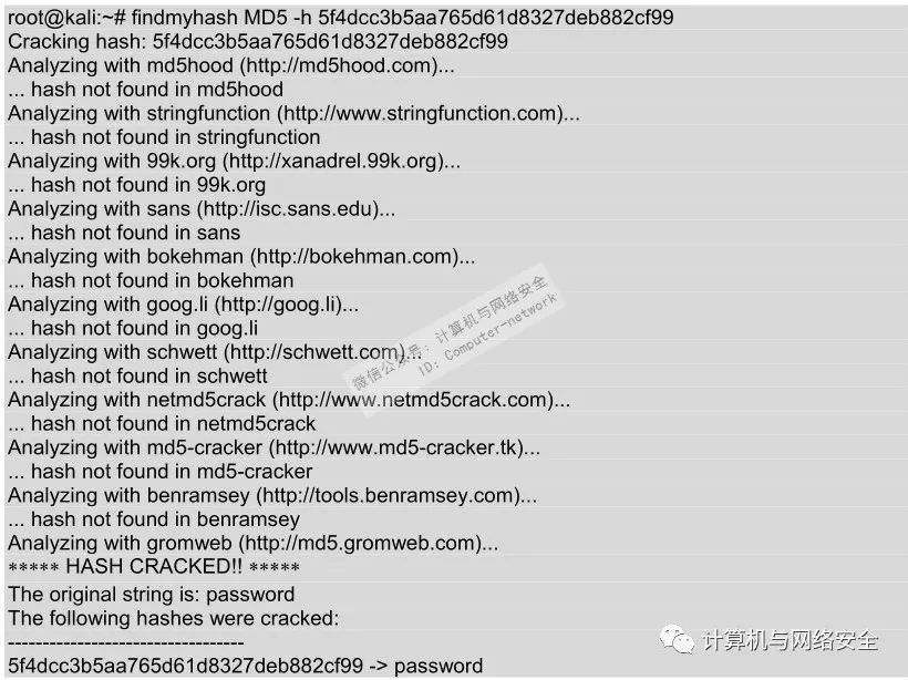 以上输出的信息是攻击LM Hashes密码的过程。经过一番的攻击,最后获取到哈希值5f4dcc3b5aa765d61d8327deb882cf99的原始密码是password。