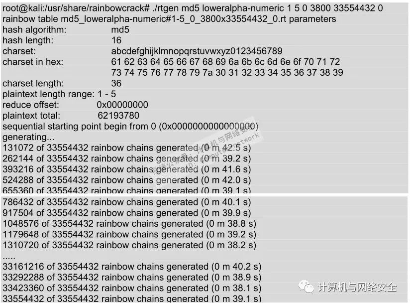 以上信息显示了彩虹表的参数及生成过程。例如,生成的彩虹表文件名为md5_loweralpha-numeric#1-5_0_3800x33554432_0.rt;该表使用 MD5散列算法加密的;使用的字符集abcdefghijklmnopqrstuvwxyz0123456789等。