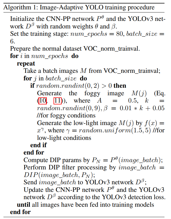为了在正常和恶劣天气条件下都能达到理想的检测性能,采用了IA-YOLO混合数据训练方案。算法1总结了提出方法的训练过程。
