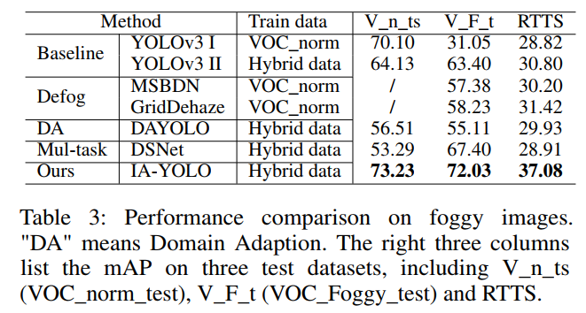 在输入到网络进行训练之前,每一幅图像都有2/3的概率被随机添加某种雾或被转换为微光图像。无论是普通的还是合成的低质量训练数据,整个过程都是端到端训练,使用YOLOv3检测损失,确保IA-YOLO中的所有模块都可以相互适应。