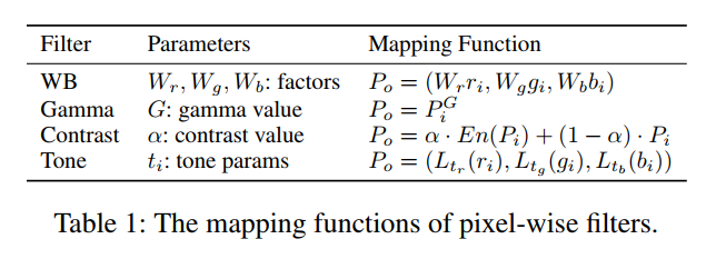 像素级滤波器映射一个输入像素值 转换为输出像素值 ,其中 分别表示红、绿、蓝三个颜色通道的值。表1列出了四个像素级过滤器的映射函数,其中第二列列出了在本文的方法中要优化的参数。WB和Gamma是简单的乘法和功率变换。显然,它们的映射函数对于输入图像和参数都是可微的。