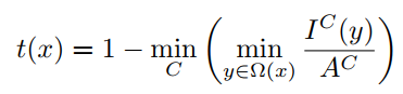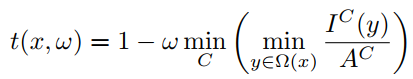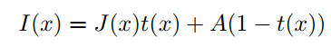其中 为雾天图像, 为场景亮度。A为全球大气光, 为介质透射图,定义为: