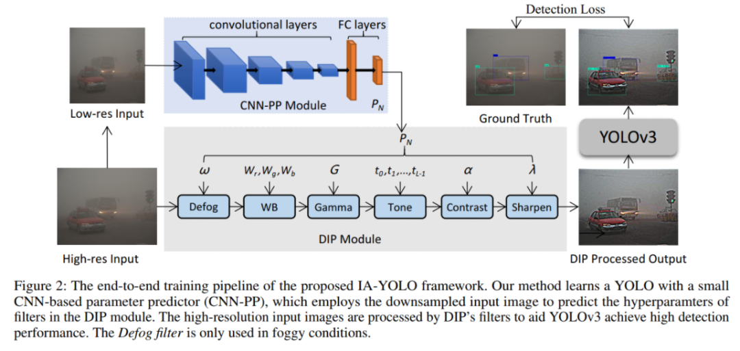 IA-YOLO以端到端的方式学习CNN-PP和YOLOv3,这确保CNN-PP可以学习适当的DIP,以弱监督的方式增强图像进行检测。