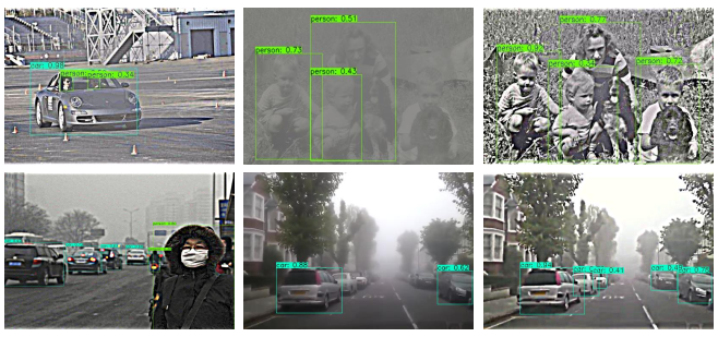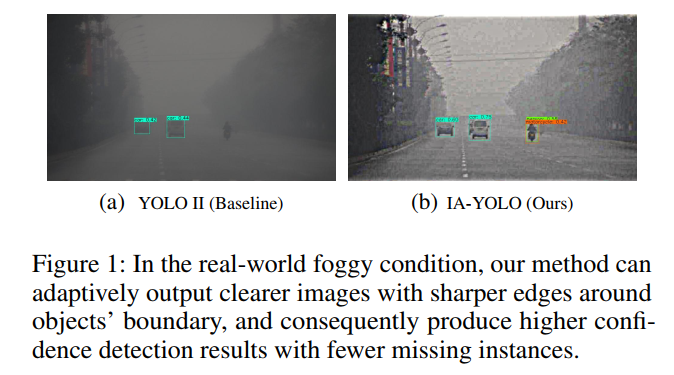 本文提出的IA-YOLO方法可以在正常和恶劣天气条件下自适应处理图像。实验结果证明了IAYOLO方法在雾天和弱光情况下的有效性。