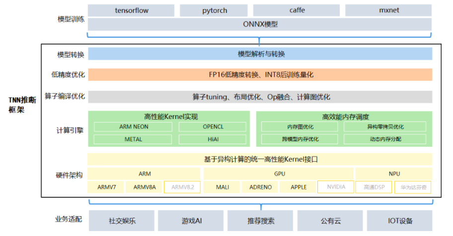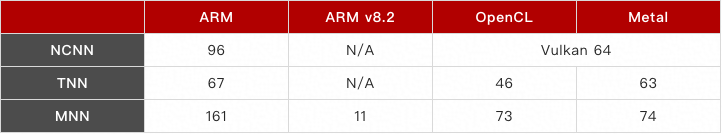 TNN设计之初一方面是为了提高算力,另一方面强调了对移动设备的支持。不然用户就没必要放弃生态很好的MNN和大家都熟悉的ncnn来使用TNN了。