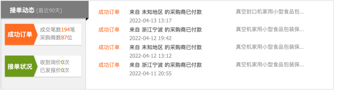 同样位于平阳县的余雄工艺品厂,在1688上拥有最高的真空封口机成交额(230万+),30天内就有5万+台成交,远超第二名的2万+台。在最近90天的接单动态中,真空封口机产品占据大半份额。该厂负责人告诉36氪,近日的批发订单不断增多,原来一天能卖2000多台,现在每天都能多卖1000多台。