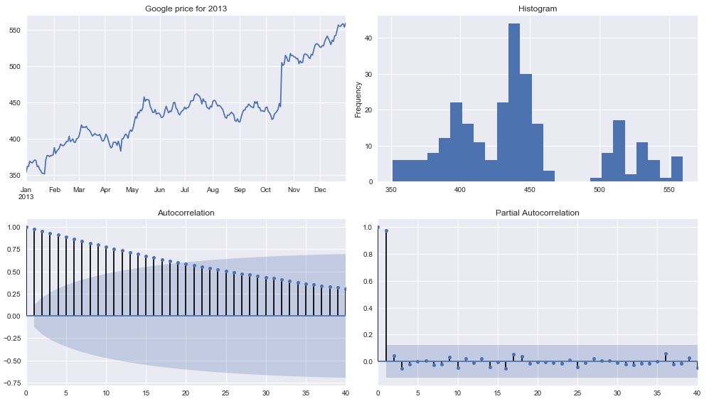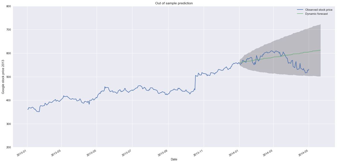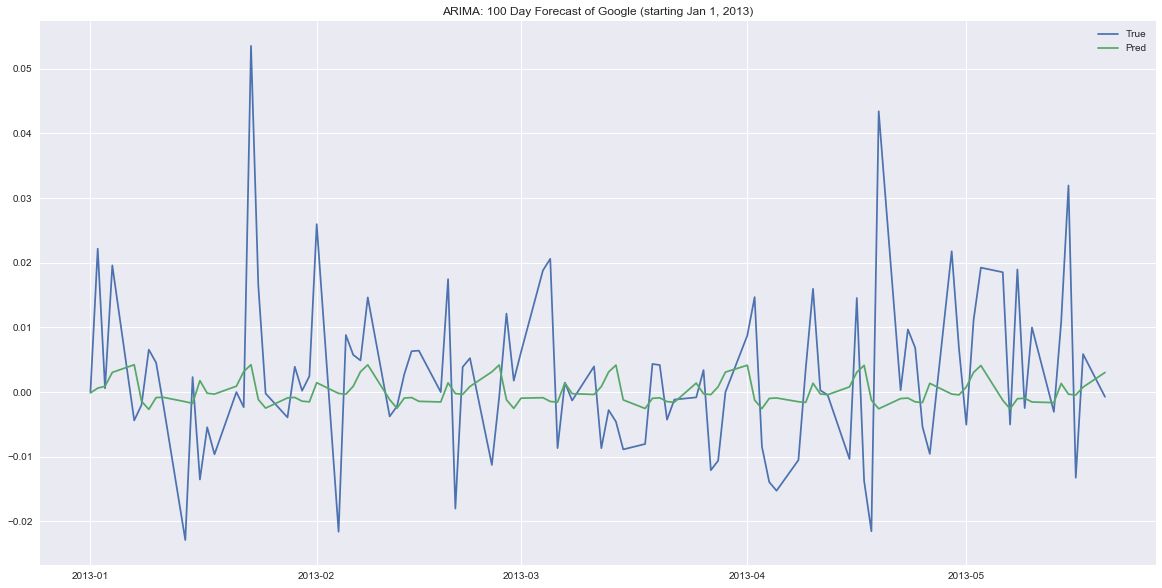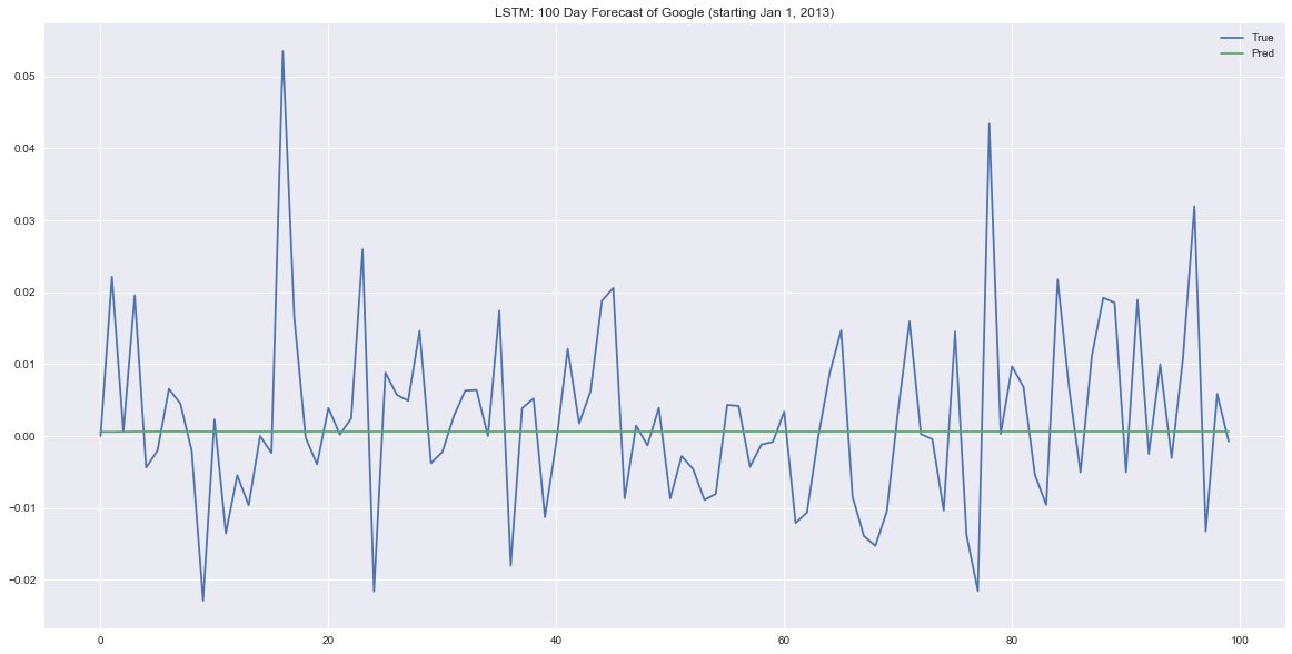 ax.set_title('LSTM: 100 Day Forecast of Google (starting Jan 1, 2013)')