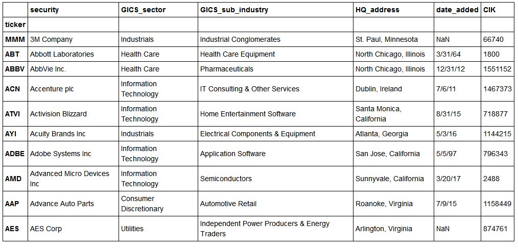'GICS_sector', 'GICS_sub_industry', 'HQ_address', 'date_added', 'CIK']