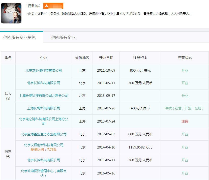 每经小编(微信号:nbdnews)根据天眼查数据发现,许朝军自2011年后在多家创业公司担任要职。其中北京龙必驰科技有限公司、北京长滩科技有限公司、上海长堤科技有限公司等五家科技公司都由许朝军担任法人代表。