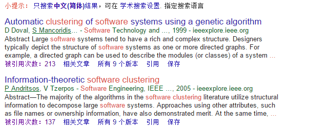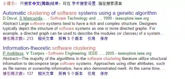 (9月26日更新)由于有朋友问我怎么查看“排名最高的那些文章被哪些文章引用了”,所以这里简单解释一下,以我目前正在做的一个topic为例,当我们在google scholar里搜索Software Clustering的时候,出现在最前面的搜索结果是这样的: