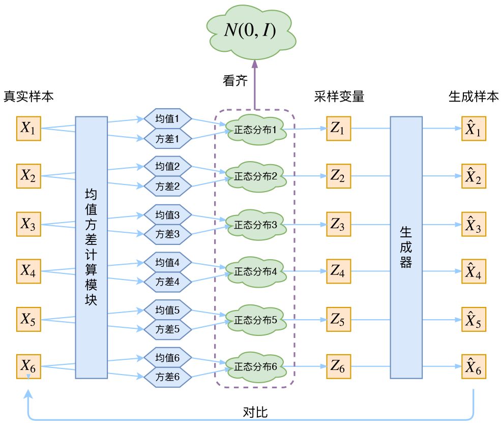 再次强调,这时候每一个 Xk 都配上了一个专属的正态分布,才方便后面的生成器做还原。但这样有多少个 X 就有多少个正态分布了。我们知道正态分布有两组参数:均值 μ 和方差 σ^2(多元的话,它们都是向量)。