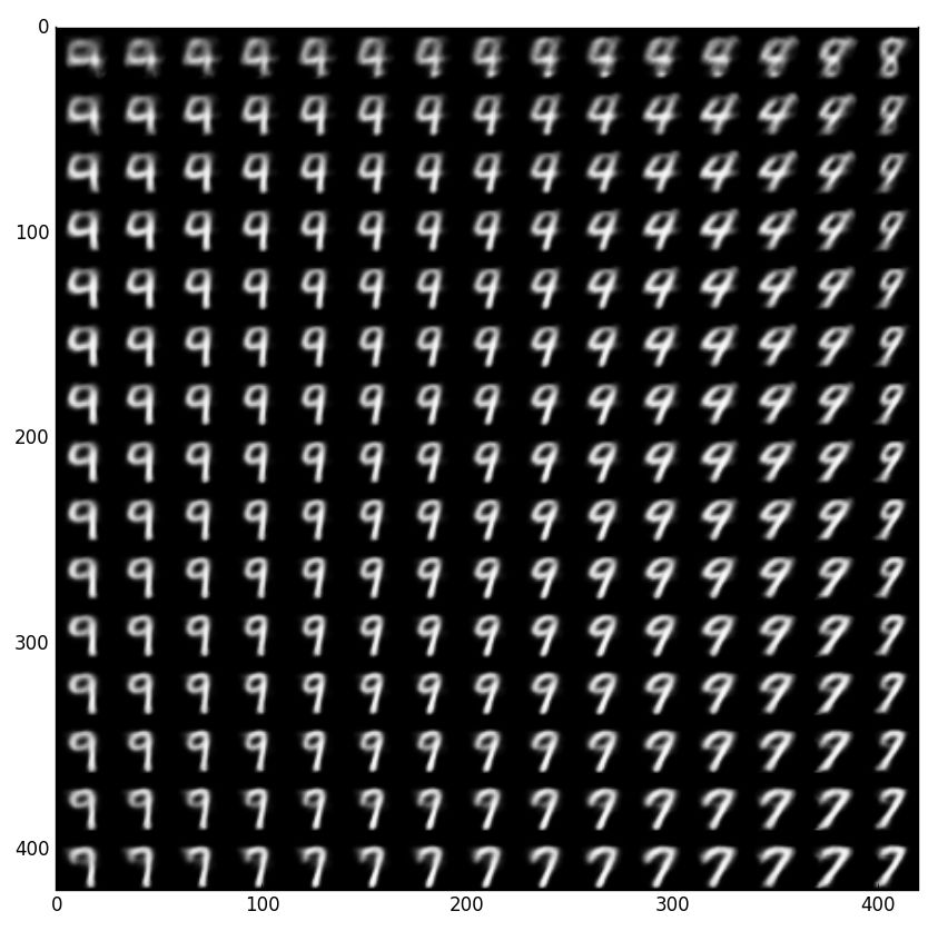 用这个 CVAE 控制生成数字 9,可以发现生成了多种样式的 9,并且慢慢向 7 过渡,所以初步观察这种 CVAE 是有效的。