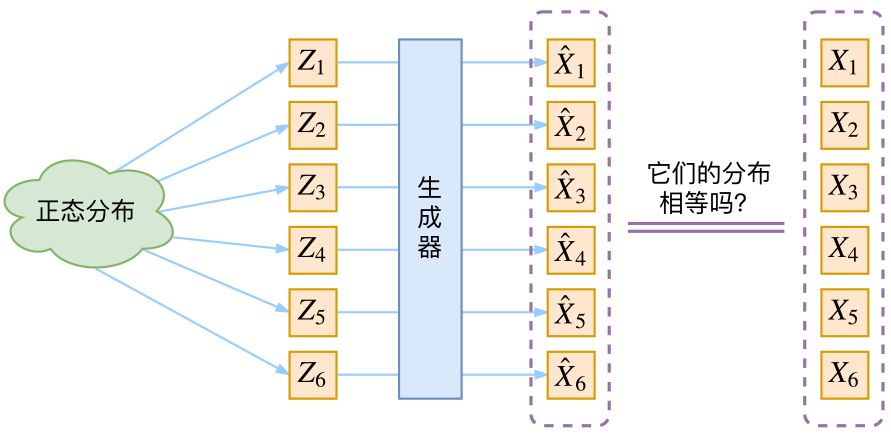 那现在假设服从标准的正态分布,那么我就可以从中采样得到若干个 Z1,Z2,…,Zn,然后对它做变换得到 X̂1=g(Z1),X̂2=g(Z2),…,X̂n=g(Zn),我们怎么判断这个通过 f 构造出来的数据集,它的分布跟我们目标的数据集分布是不是一样的呢?