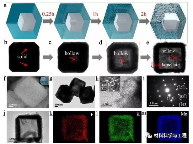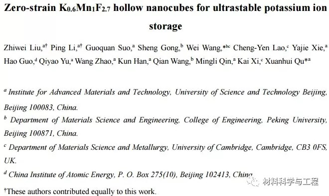 近日,北京科技大学新材料技术研究院曲选辉团队在Energy & Environmental Science(IF=30.067)上发表了题为“Zero-strain K0.6Mn1F2.7 hollow nanocubes for ultrastable potassium ion storage”的论文(DOI: 10.1039/C8EE01611A),该工作报道了一种合成均匀中空KMnF-NCs的新方法,并通过控制刻蚀反应时间在晶体结构中创造缺陷与空位。
